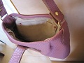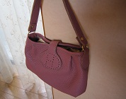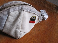 革のパッチワーク、しかも裏地も革。なので、けっこう丈夫。貝殻のようにぷっくりとしたカタチで、デジカメを入れて重宝しています。ボダムのケトルのピンバッジでおしゃれしてあげました。ピンバッジ好きなので、せっかくのコレクションは洋服に限らず使ってあげなきゃネ。