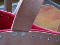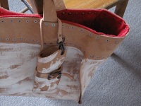 独創的に見えますが、実はリスペクトする作家サマ、Houseの増満氏の技法を取り入れさせていただいたbagです。トコガワは皮が「革」へと進化するなかでできる・・・極端にいえばゴミ的な部分です。そのトコガワにカシメを裏使いで打ち合わせてジャンクでアートな雰囲気をかもし出した彼の作品~